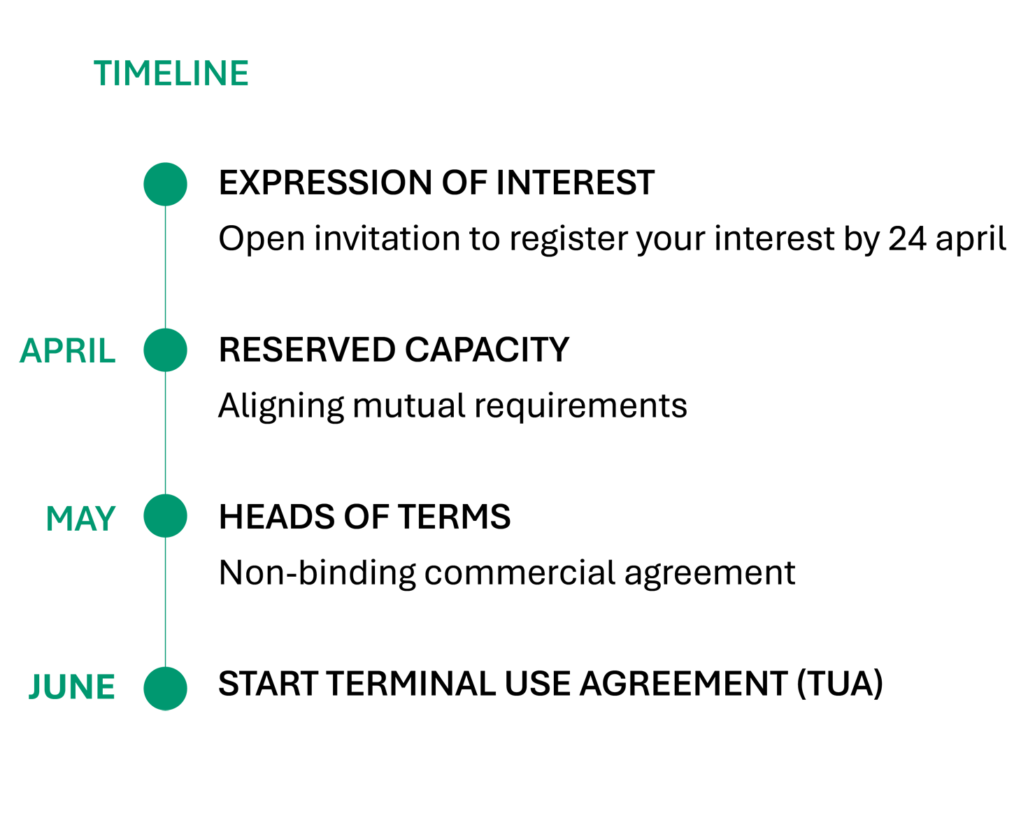 This phase will culminate in a mutual understanding of reserved capacity which will be agreed in non-binding Heads of Terms agreement. The final step will be to get to a binding Terminal Use Agreement.